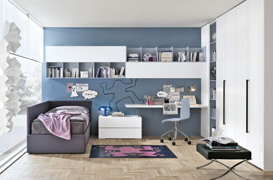Composizione Tommy T14. Contenitori sospesi e armadio laccati opachi bianco gesso. Libreria scorrevole per armadio e librerie orizzontali biblo celeste opaco. Scrittoio laccato gesso con raccordo per cassettiera in metacrilato. Sedia beverly. Letto tessile corner con sponda sx alta. |